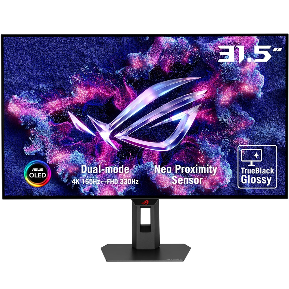 ASUS شاشة WOLED مقاس 31.5 بوصة TrueBlack Glossy مستشعر القرب Neo Proximity تغطية ألوان 99% DCI-P3 مع Delta E < 2 صور فائقة الوضوح والحدة تقنية المساعد الذكي A.I.: AI Visual وضع مزدوج: 4K عند 165 هرتز / FHD عند 330 هرتز متوافق مع معيار VESA DisplayHDR™ 400 True Black