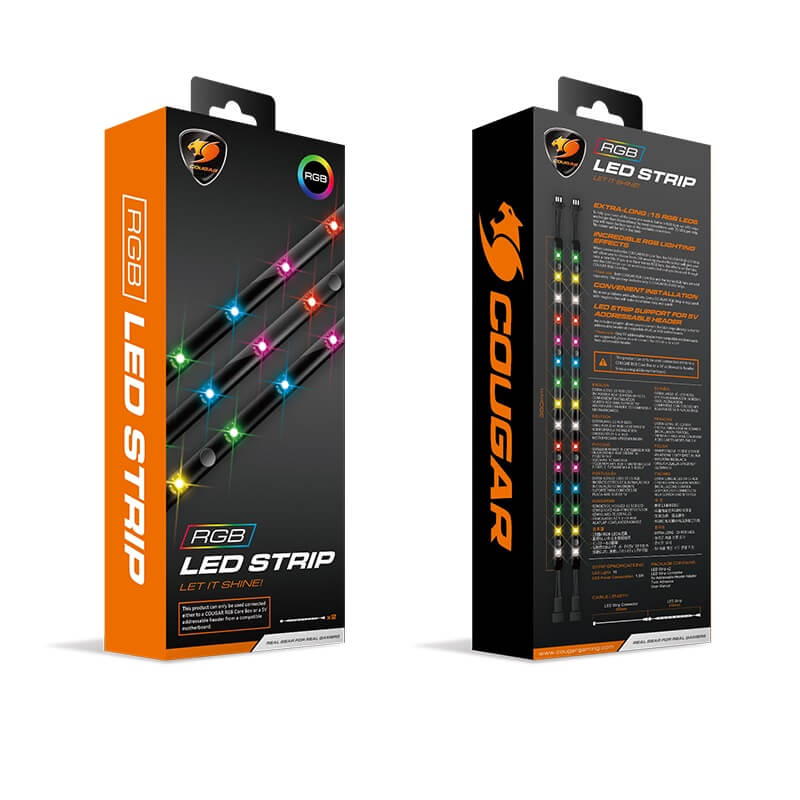 When connected to the COUGAR Core Box, Core Box C or Core Box v2, the COUGAR RGB LED Strip will allow you to choose from 100 amazing visual effects that will give your case a new life. If you also have Vortex RGB fans, the effects on the fans and the LED strips can be wirelessly controlled and synchronized. With Core Box C or Core Box v2, connection to compatible motherboards’ 5v RGB header for system-wide synchronization is also possible.(Note: Both Core Box/Core Box C/Core Box v2 and the Vortex RGB fans are sold separately. This package includes only two COUGAR RGB LED Strips)