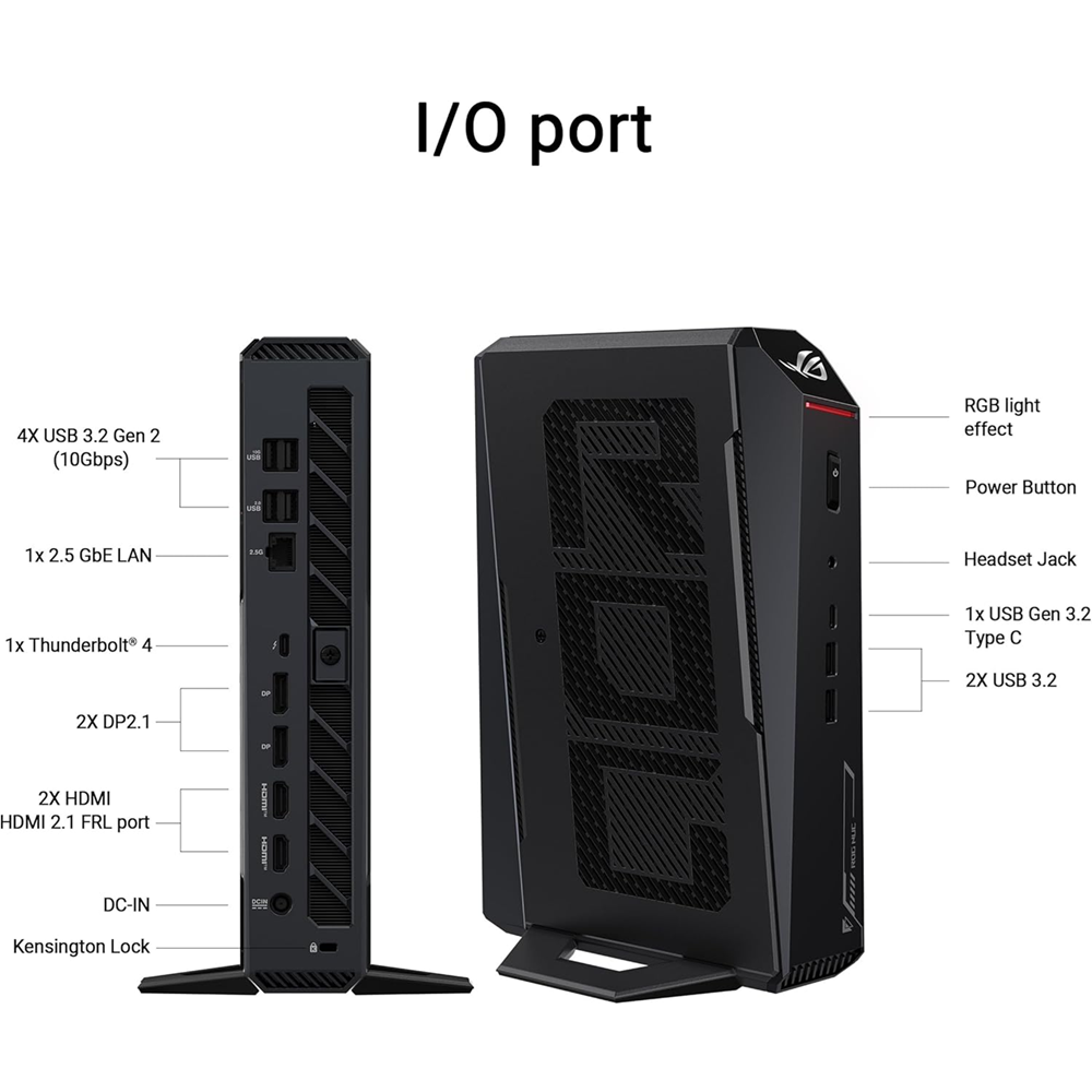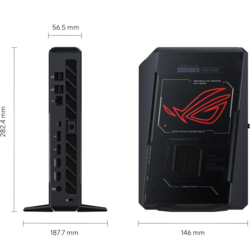 ASUS ROG NUC Nvidia Geforce RTX 5070Ti Laptop GPU Intel® Core™ Ultra 9 Processor 275HX 1TB Gen4 NVMe SSD (1x M.2 slot PCIe x4 Gen4) 32GB (2x 16GB) DDR5-5600 RAM (Support 48GB) 1x Thunderbolt™ 4 | 1x HDMI2.1 | 2x DP 2.1 WiFi 7 | Bluetooth 5.4 | 4x USB-A Ports Windows ®11 Home 64-bit